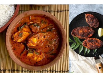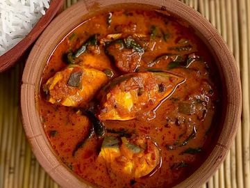 Tamil Nadu style fish curry with shallots, tamarind, and curry masala with rice. Portion Size: Curry ~250 gms, Rice - 450 gms
