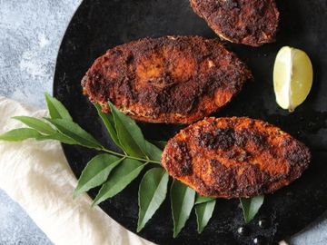 Katla fish fry, tawa fried with homemade masala. Portion Size: ~180 gms
